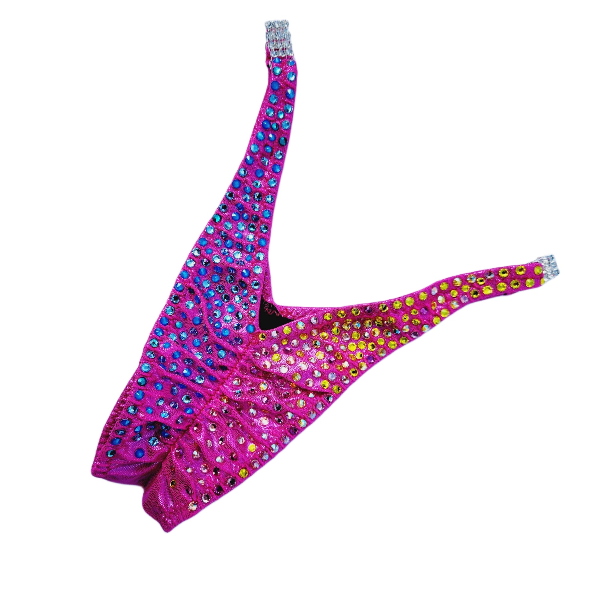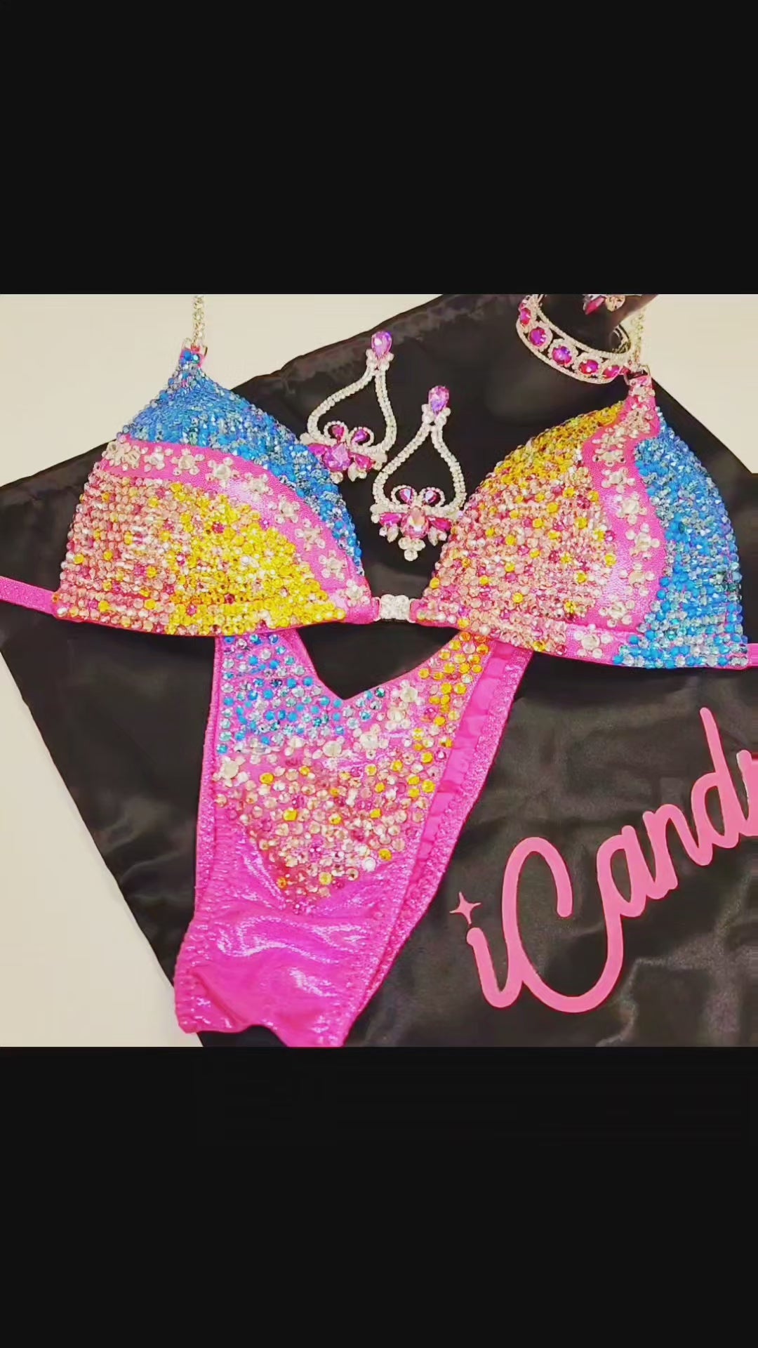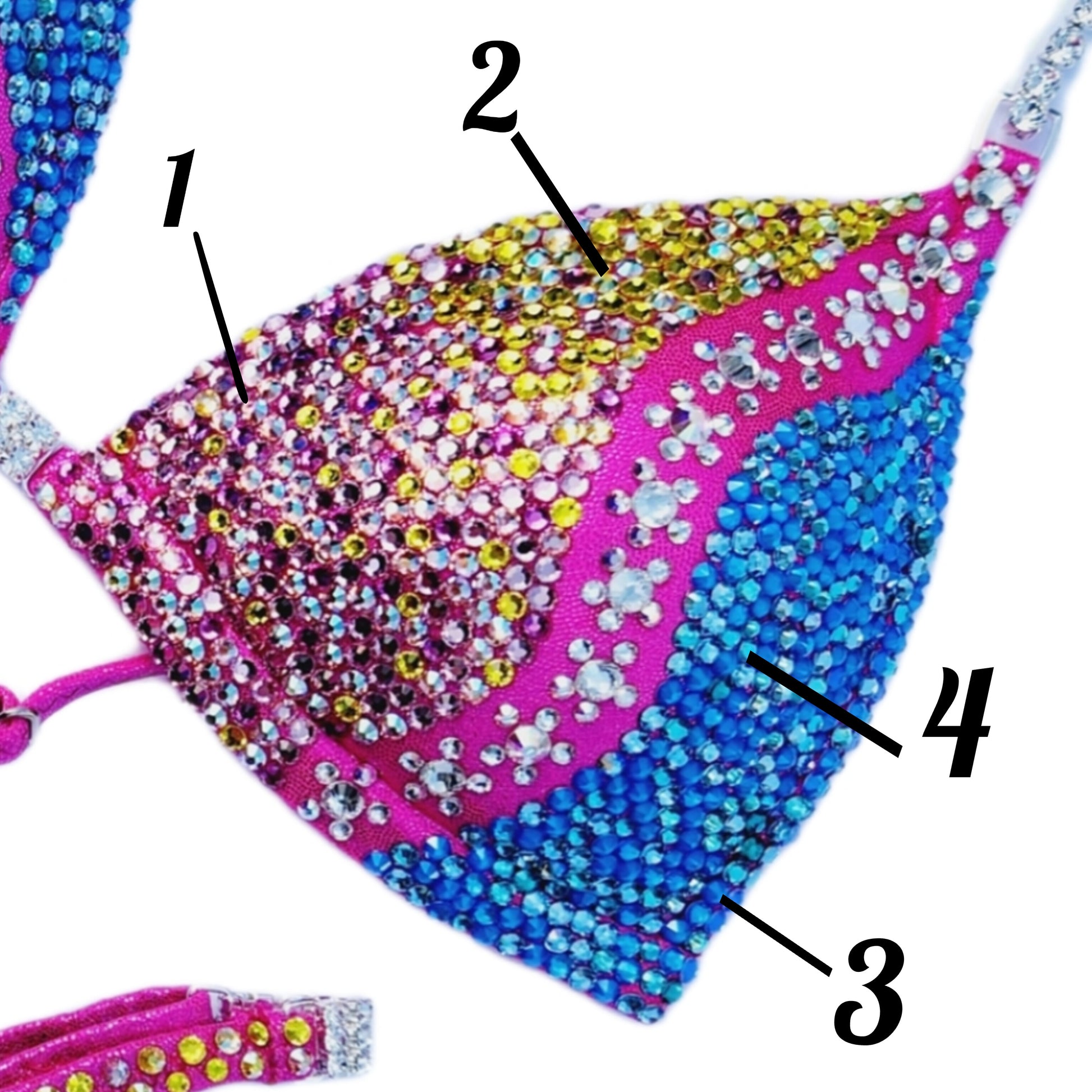 This unique design will really set you apart on stage! This radiant beauty is adorned with 4 colors of the most faceted crystals as well as a trail of crystal clear flowers.